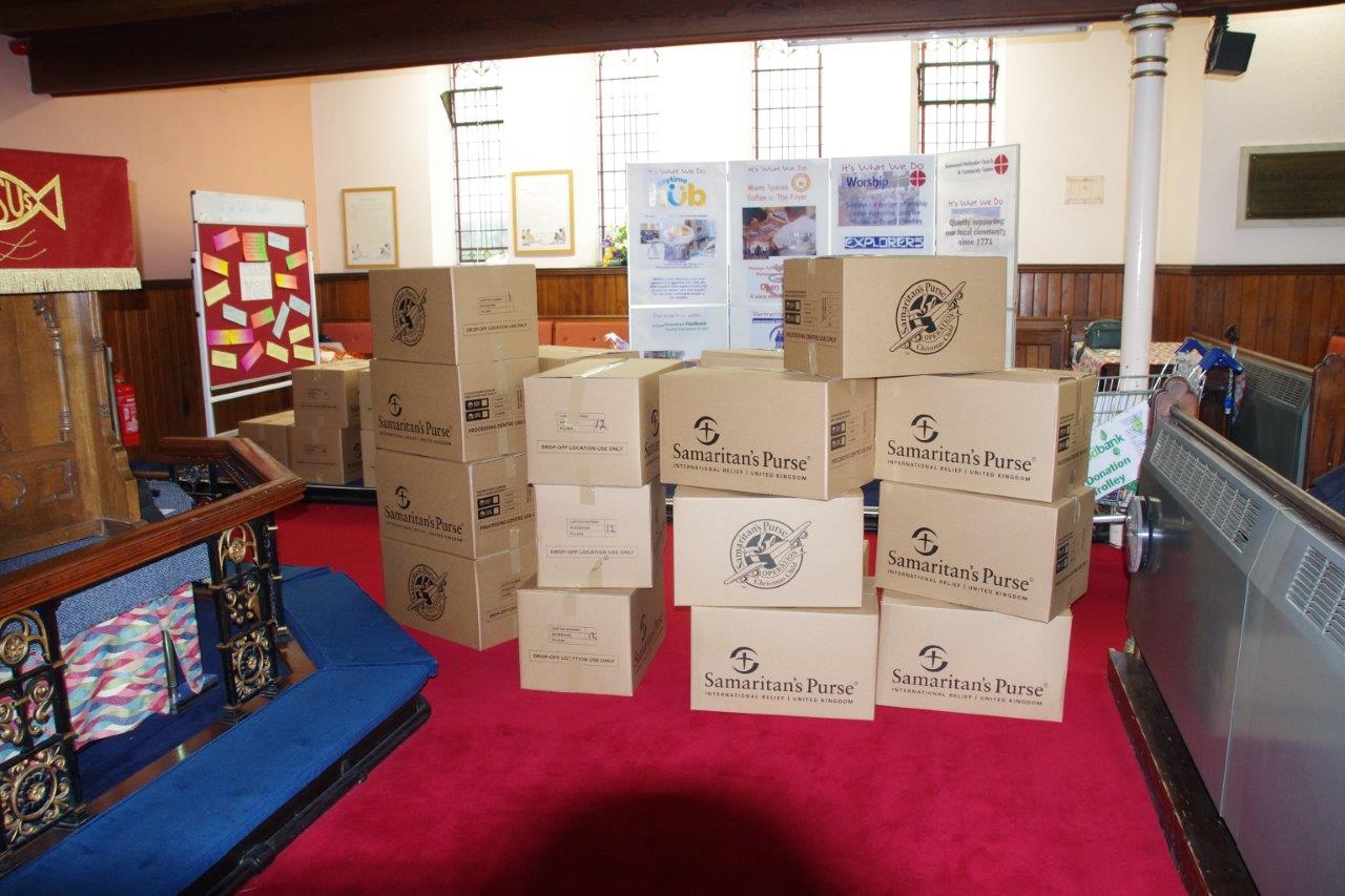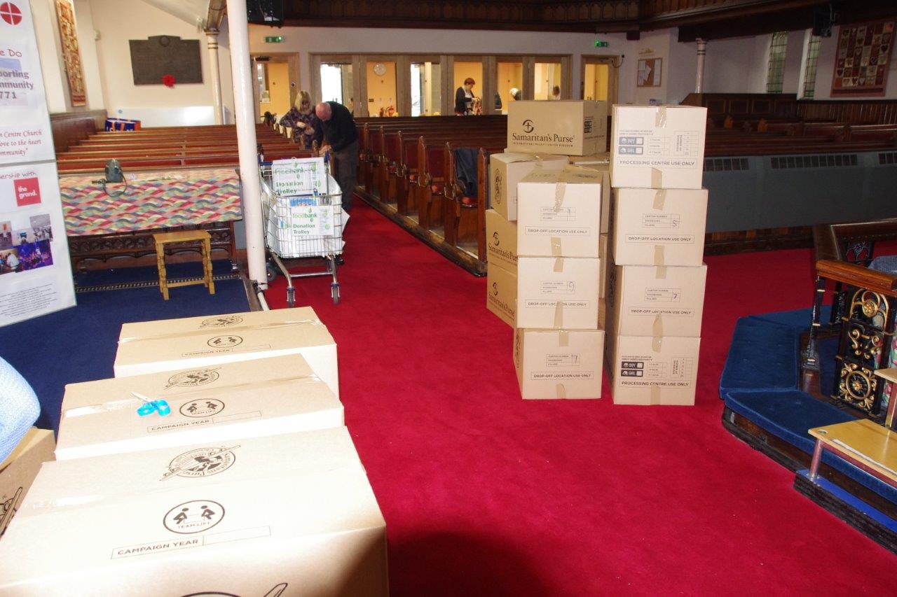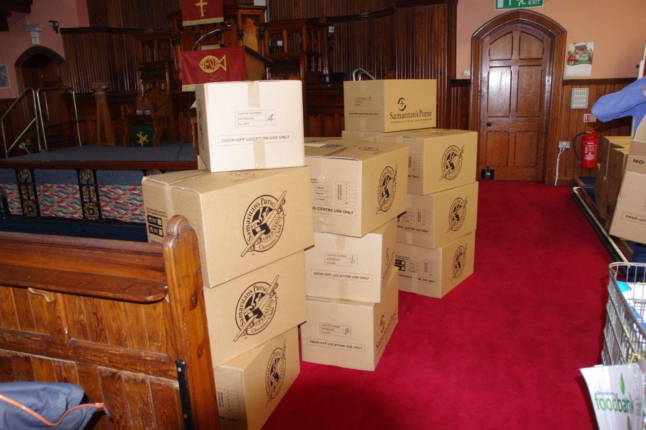 Shoeboxes collected at our Church ready to begin their journey with the help of Samaritans Purse